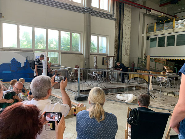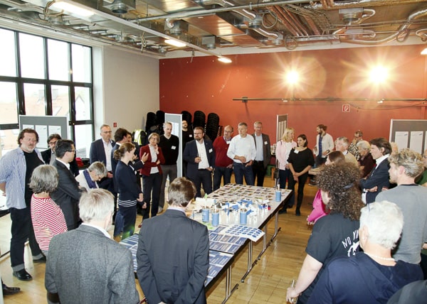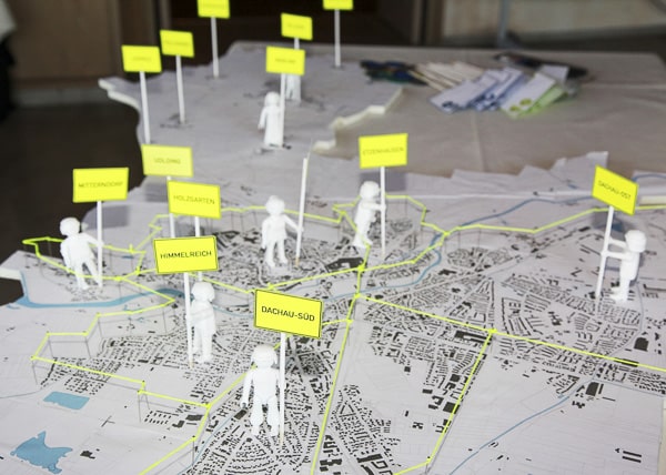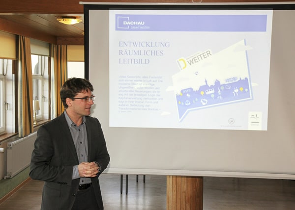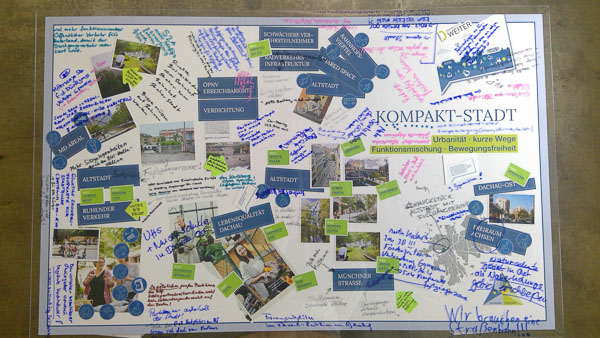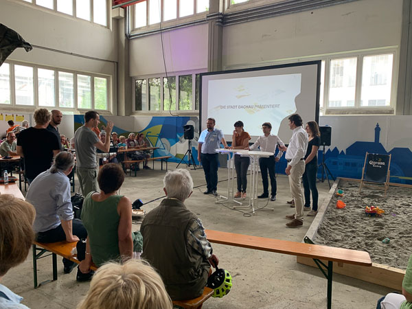 Rund 300 Bürger informierten und beteiligten sich intensiv am Bürgerworkshop in der Zentralwerkstatt des MD-Areals. Nach der Begrüßung durch den Oberbürgermeister Florian Hartmann folgte ein kurzer Einführungsfilm, der den bisherigen Prozess dokumentierte und Beiträge einzelner Arbeitsgruppenmitglieder zu den Zukunftsbildern Dachaus zeigte. Im Stadtlabor konnten die Bürger – neben der Möglichkeit Collagen und Leitgedanken der Arbeitsgruppe zu kommentieren – Strukturen im Flächennutzungsplan zeichnerisch ergänzen und Impulsmaßnahmen benennen. Zwei Fachvorträge zum Thema Coworking und gesellschaftliche Teilhabe ergänzten das Beteiligungsprogramm. Einen stimmigen Ausklang bot der Dachauer Multipercussionist Christian F. Benning.