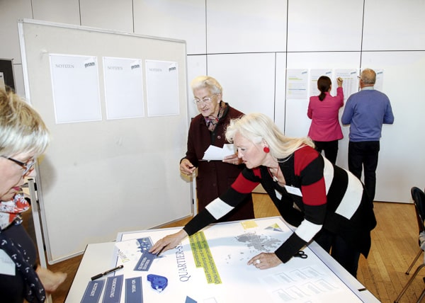 Am 30.04.2019 hatten die vom Bau- und Planungsausschuss ausgewählten Arbeitsgruppenmitglieder im Rahmen eines Workshops die Gelegenheit, ihre Ideen zur Gestaltung ihres Lebensumfeldes einzubringen. Auf vorbereiteten Profiltischen konnten sie die Wünsche und Vorstellungen zu insgesamt neun Themen als Bildcollagen gestalten.