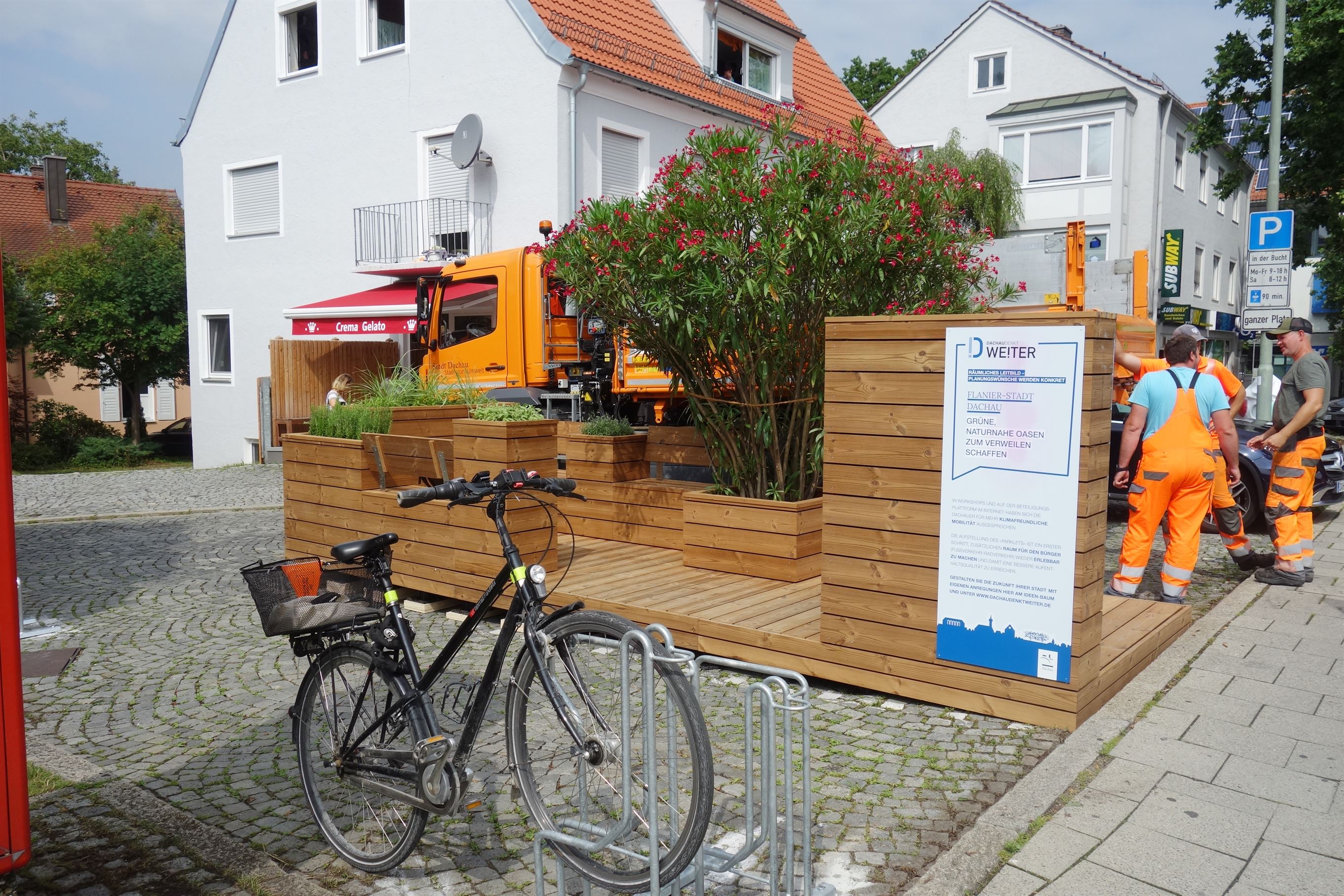 Seit dem 30.07.2019 ersetzt das Parklet 2 Parkplätze in der Münchner Straße und bietet dem Leitgedanken der Flanierstadt Raum und Angebot. Ein Parklet wandelt einen Parkplatz in eine kleine Flanier-Station mit Wohlfühlfaktor um und zeigt »Dachau denkt weiter!« Ob Minigarten, Sitzlandschaft oder einfach nur ein paar Fahrradbügel – auf einem Parklet ist viel Platz für Kreative Ideen. Das Projekt entstand in kürzester Zeit, angeregt durch die vielen Beiträge der Bürger zum Thema Mobilität.
